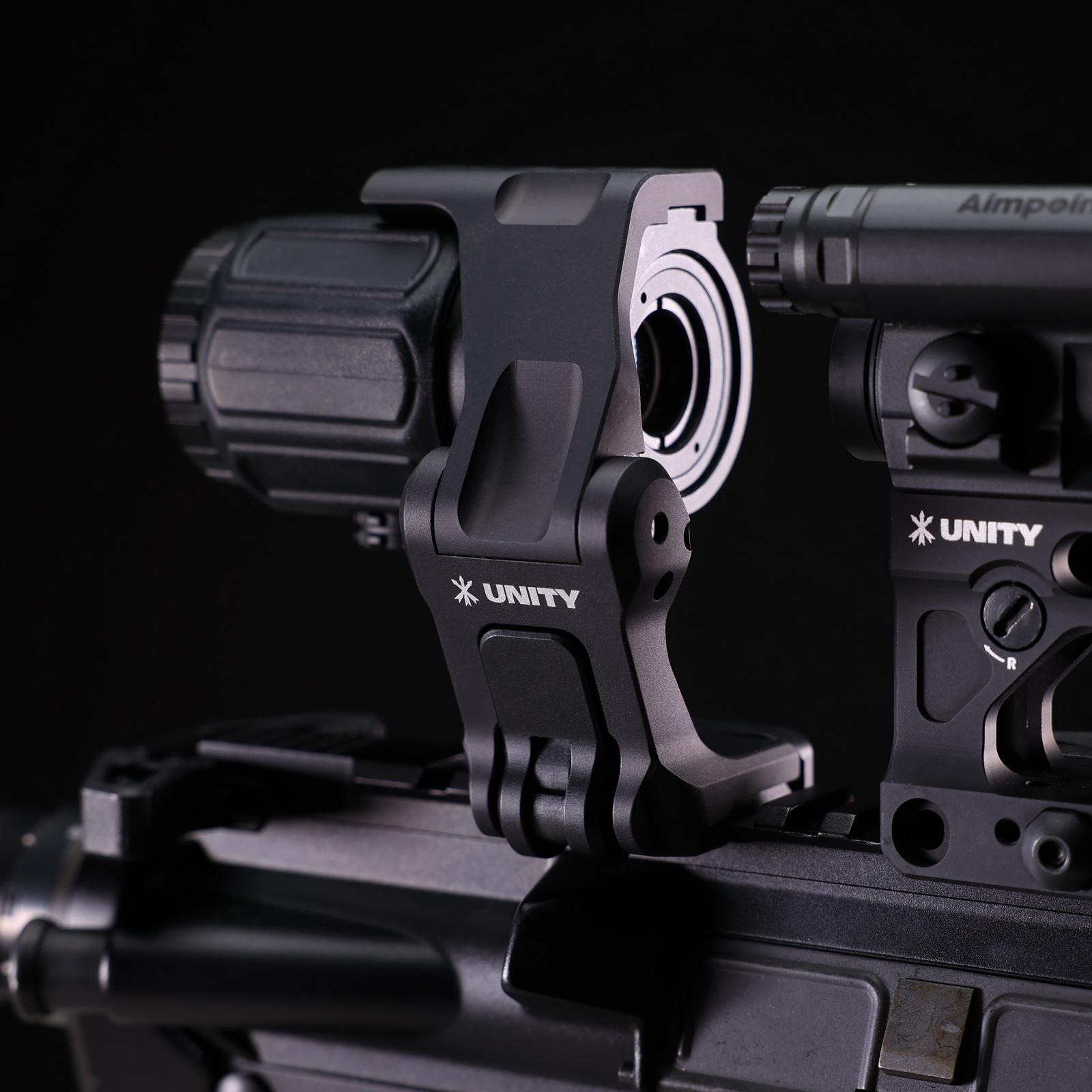 Unity Tactical FAST™ FTC OMNI Magnifier Mount to rewolucyjny montaż rozwiązujący problem z powiększalnikami zamocowanymi na karabinkach. Dzięki opatentowanemu mechanizmowi Flip-To-Center (FTC), nieużywany powiększalnik znajduje się w osi broni a nie wystaje na bok, zwiększając obrys karabinka, ryzyko zahaczenia o framugi albo w trakcie skoków spadochronowych czy zjazdów na linach. Zwykłe montaże powiększalnika, odchylane na bok, mogą w ekstremalnej sytuacji doprowadzić do uszkodzenia optyki lub utraty zdrowia.